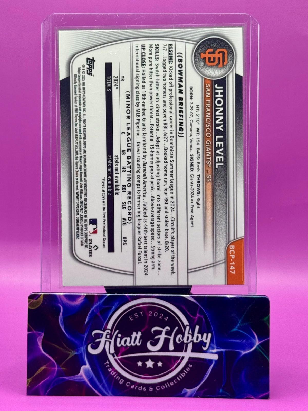 The product is a 2025 Bowman Chrome baseball trading card featuring Jhonny Level of the San Francisco Giants. This card is part of the Chrome Prospects insert set and is a Mojo Refractor parallel variety. Produced by Topps, the card is an original and not a reprint, and is in English. It is a standard-sized card manufactured in the United States for Major League Baseball fans and collectors.