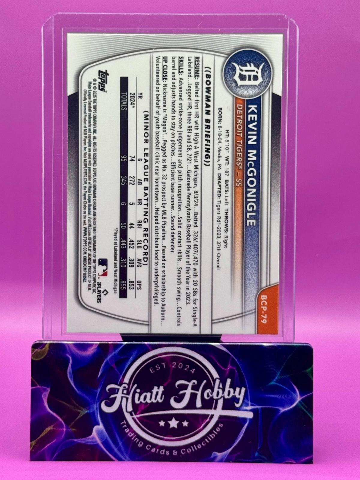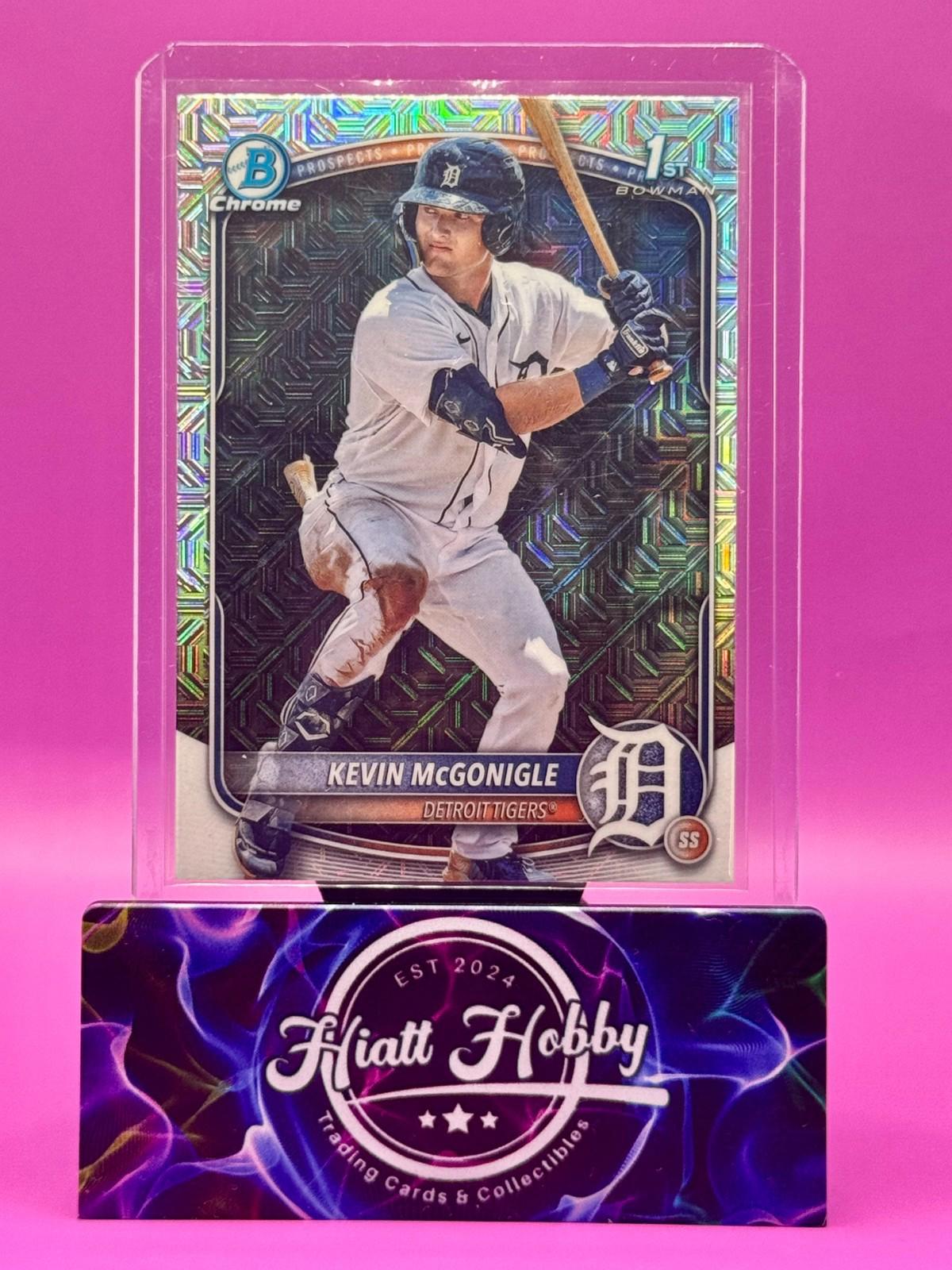 The product is a 2025 Bowman Chrome baseball trading card featuring Kevin McGonigle of the Detroit Tigers. This particular card is a Mojo Refractor parallel variety from the Chrome Prospects insert set. Manufactured by Topps, it is an original licensed reprint with English language text. It is a rookie card from the 2025 season, part of the MLB World Series tournament. This collectible item is a must-have for fans of Kevin McGonigle and the Detroit Tigers, showcasing a unique design and valuable for any baseball card collection.