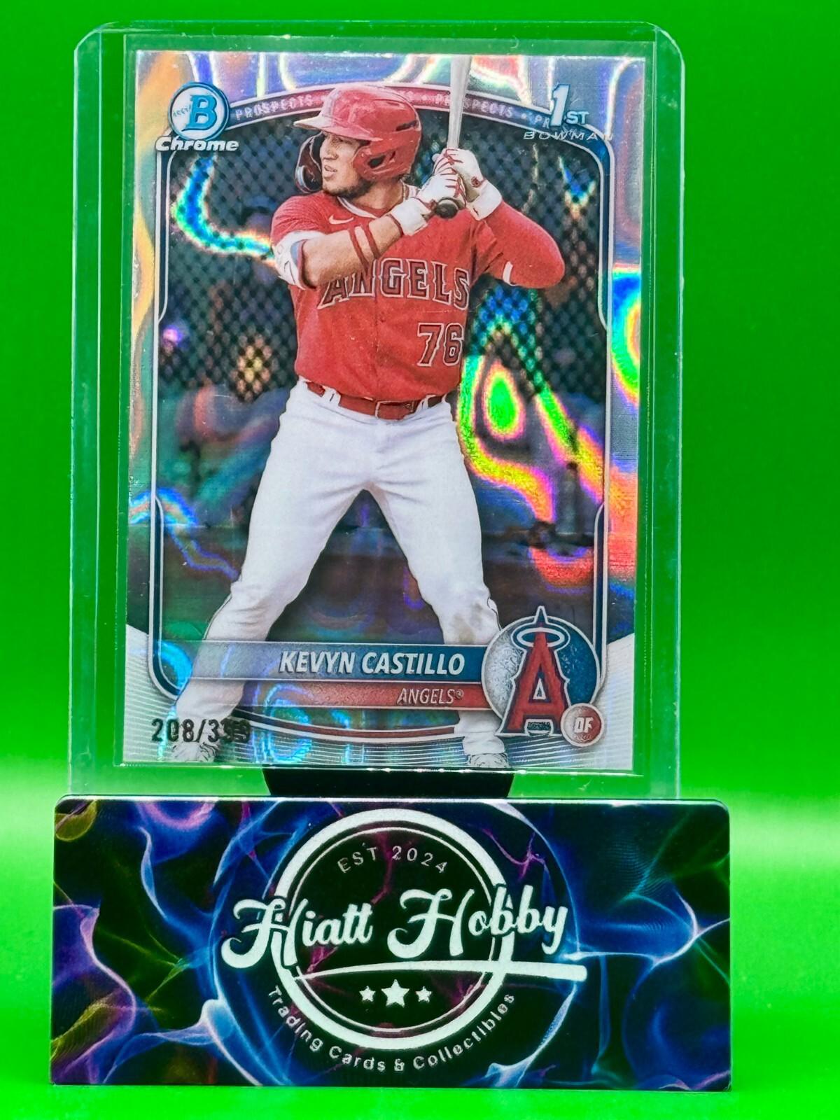 Up for sale is a 2025 Bowman Chrome card featuring Kevyn Castillo of the Los Angeles Angels. The card is a Lava Refractor variant and has a limited print run of 399. This original card is perfect for any baseball fan or collector.The card is standard sized and has not been autographed. It is part of the 2025 Bowman set and is a great addition to any collection. The card is in near mint or better condition and is graded via the original listing. Don't miss out on the chance to own this rare card!