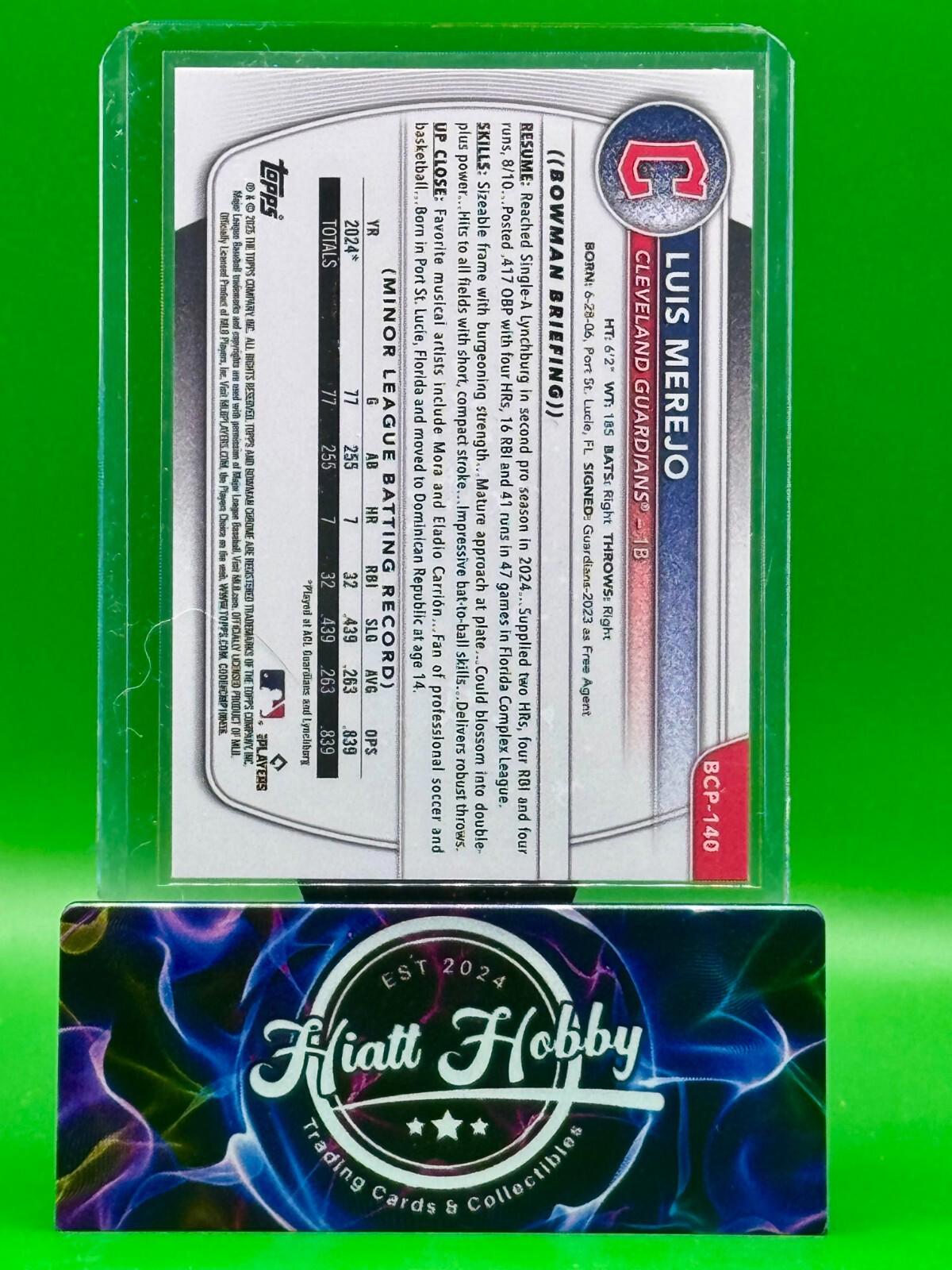 This 2025 Bowman Chrome sports trading card features Luis Merejo of the Cleveland Guardians in the Major League (MLB). The card is an original, licensed reprint and is part of the Reptillian Refractor parallel/variety. It is a rookie card with a print run of BCP-140 and is in English. The card is from the 2025 Bowman Chrome set and is graded as Near Mint or Better. It is a standard-sized card that was manufactured in the United States by Topps. The card is perfect for any baseball fan or collector looking to add to their collection.