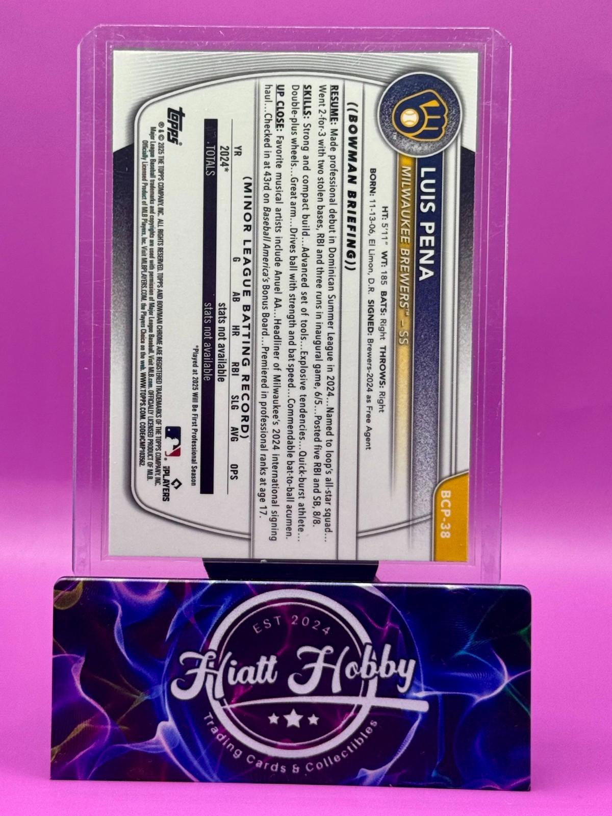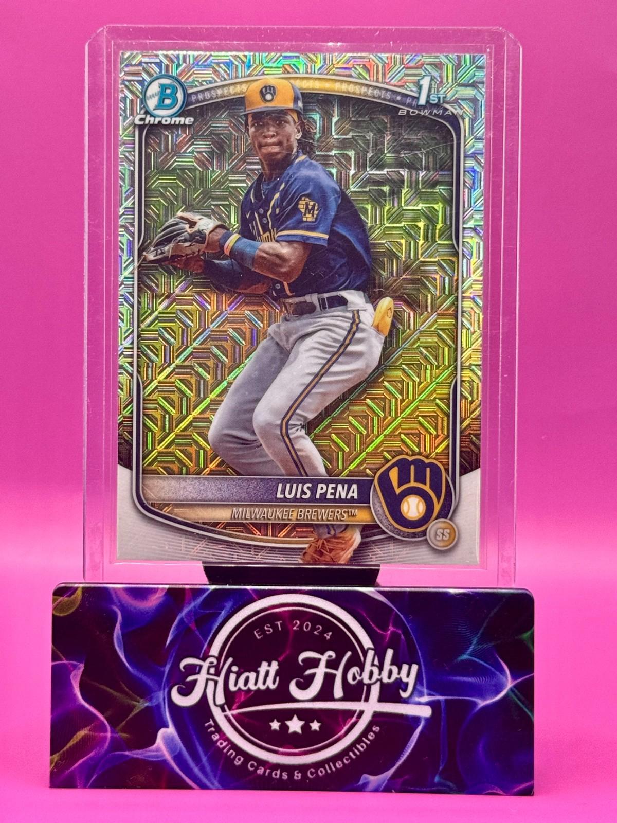 The 2025 Bowman Chrome Luis Pena #BCP-38 Mojo Refractor is a baseball sports trading card featuring the standout player from the Milwaukee Brewers team. This original English language card manufactured by Topps is part of the Chrome Prospects insert set, perfect for collectors looking to add a unique and sought-after piece to their collection. The card's design, featuring a Mojo Refractor parallel variety, adds an extra element of interest for fans of the MLB World Series and rookie players like Luis Pena.