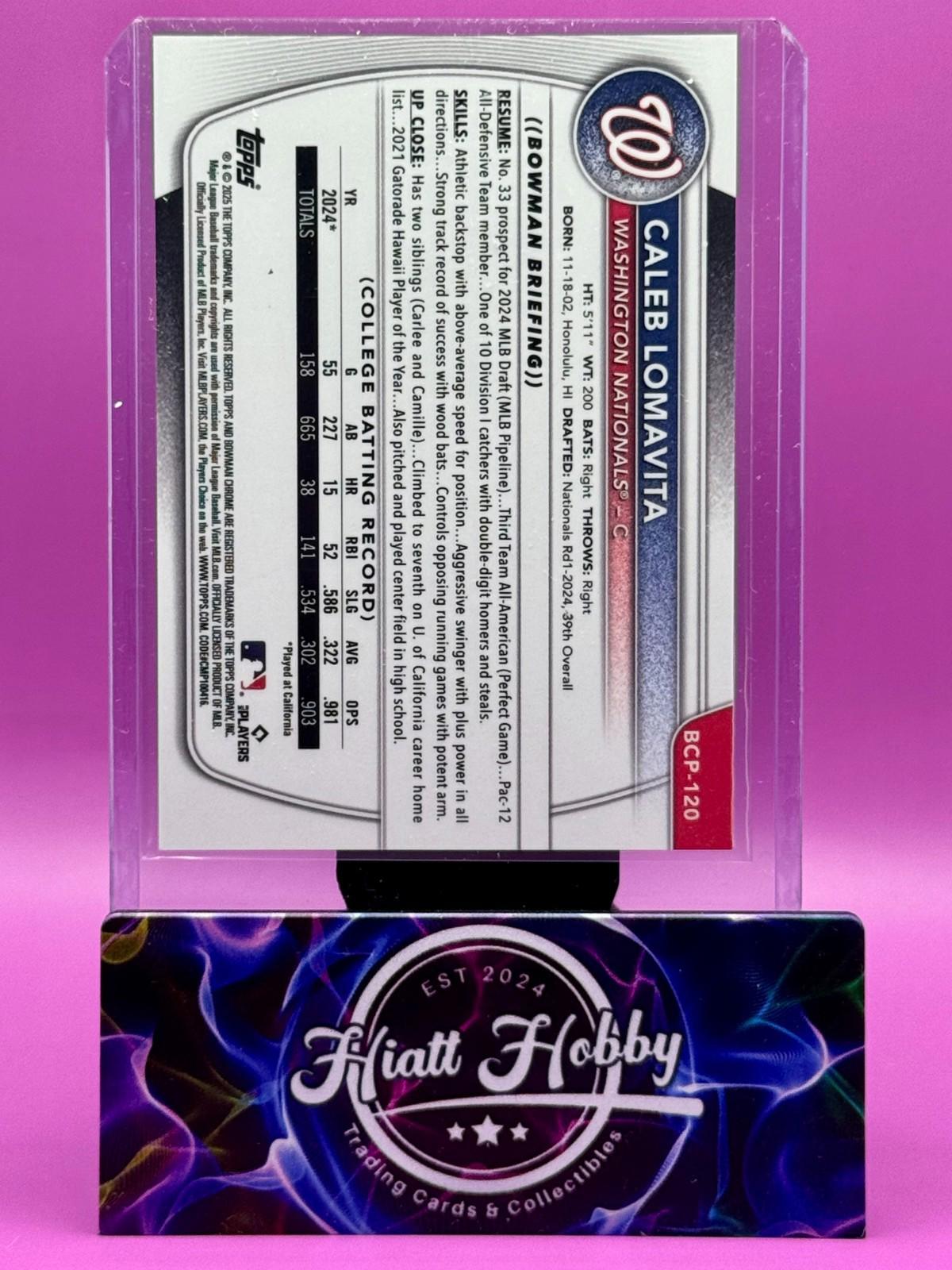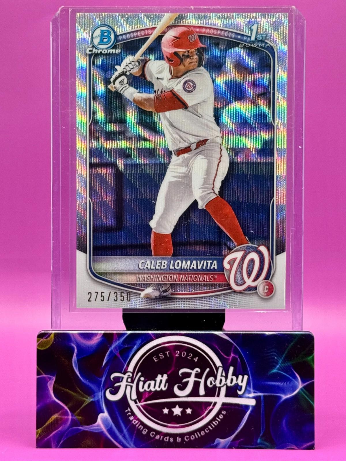 The 2025 Bowman Chrome Prospects Caleb Lomavita #BCP-120 Wave Refractor /350 (RC) trading card is an original release by Topps, featuring the MLB World Series and Washington Nationals player Caleb Lomavita. This English-language card is a standard size sports trading card manufactured in the United States, with features like serial numbering and rookie designation. Limited to only 350 copies, this wave refractor parallel adds a unique touch to any baseball card collection.