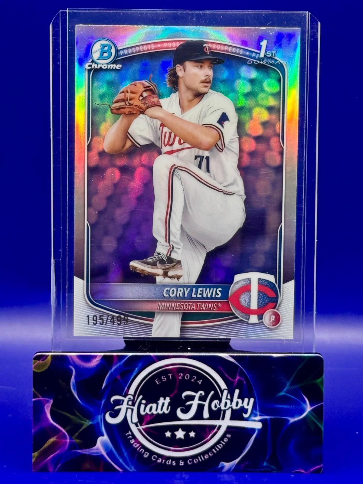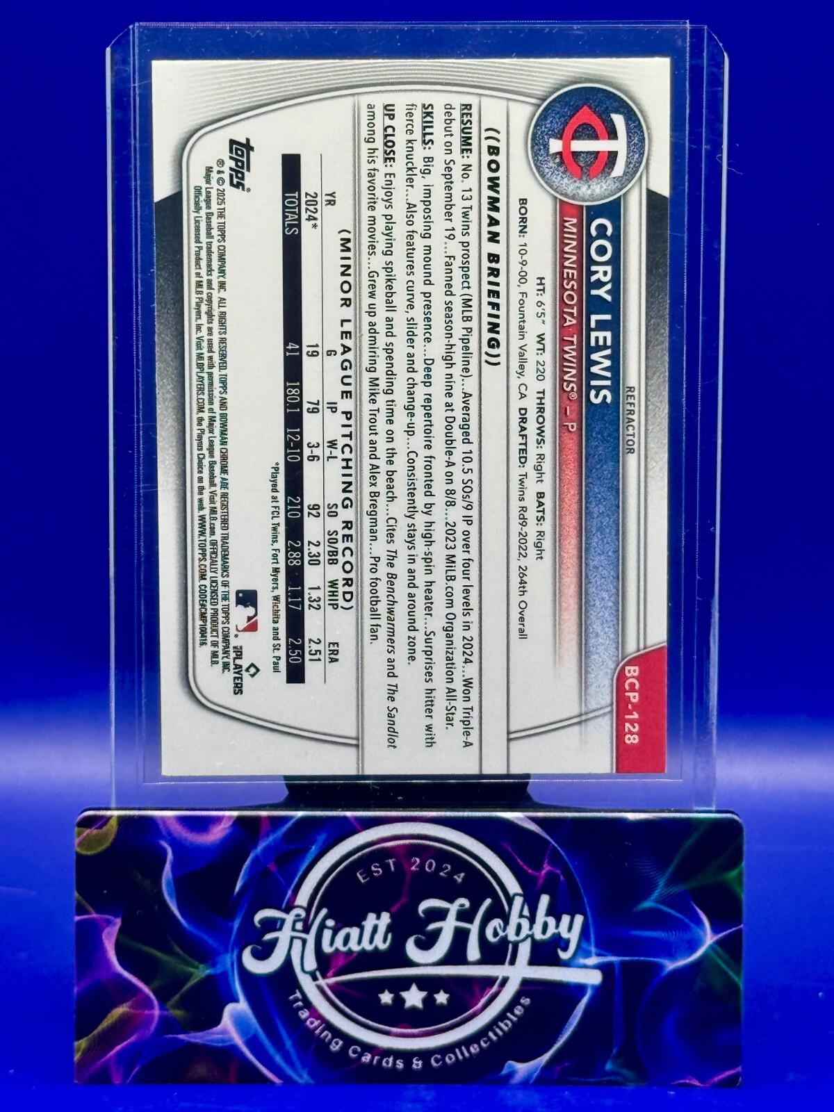 The product is a 2025 Bowman Chrome Prospects Cory Lewis #BCP-128 Refractor card, limited to a print run of 499. This original sports trading card features the Major League Baseball player Cory Lewis from the Minnesota Twins. Manufactured by Topps, the card is made of card stock and is part of the MLB World Series event. It is a Chrome Refractor parallel variety, serial numbered and considered a rookie card for the 2025 season.