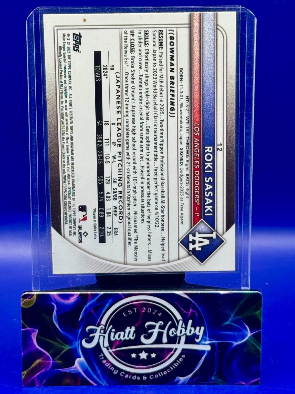 The 2025 Bowman Chrome Roki Sasaki #12 Red Rookie Redemption card is a highly sought-after sports trading card featuring the talented baseball player Roki Sasaki from the Los Angeles Dodgers. Manufactured by Topps, this original card is part of the Major League Baseball (MLB) set for the 2025 season. Made of card stock with a Chrome Refractor parallel variety, this English-language card is a valuable addition to any baseball card collection. With its unique design and rookie status, this card is a standout piece for fans and collectors alike.