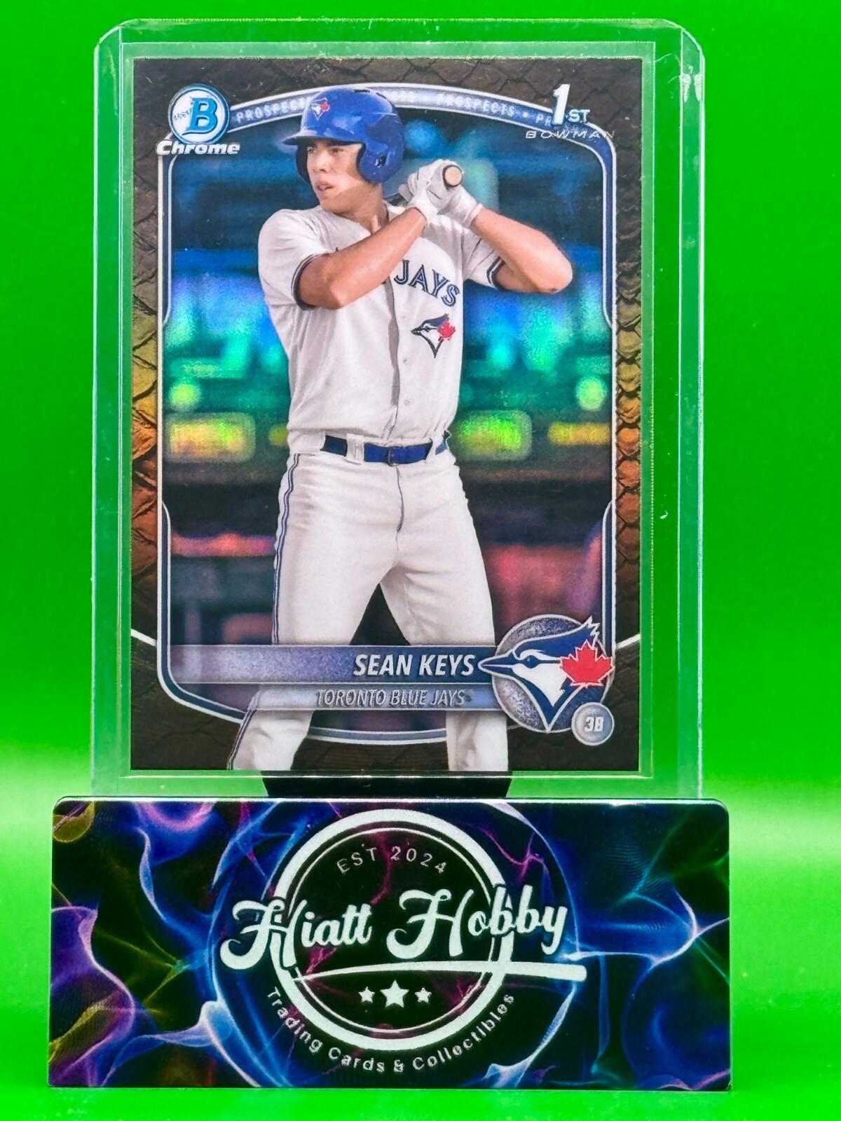 This 2025 Bowman Chrome sports trading card features Sean Keys of the Toronto Blue Jays in the Major League (MLB). The card is an Original/Licensed Reprint, with a Card Size of Standard and a Card Thickness of 20 Pt. It is part of the Reptillian Refractor Parallel/Variety set, and is a Rookie card with the card number BCP-89. The card is in Near Mint or Better condition, and is an excellent addition to any baseball fan's collection. The card was manufactured by Topps in the United States, and is a great reminder of the MLB World Series event. This card is a must-have for any collector looking to complete their 2025 Bowman Chrome set.