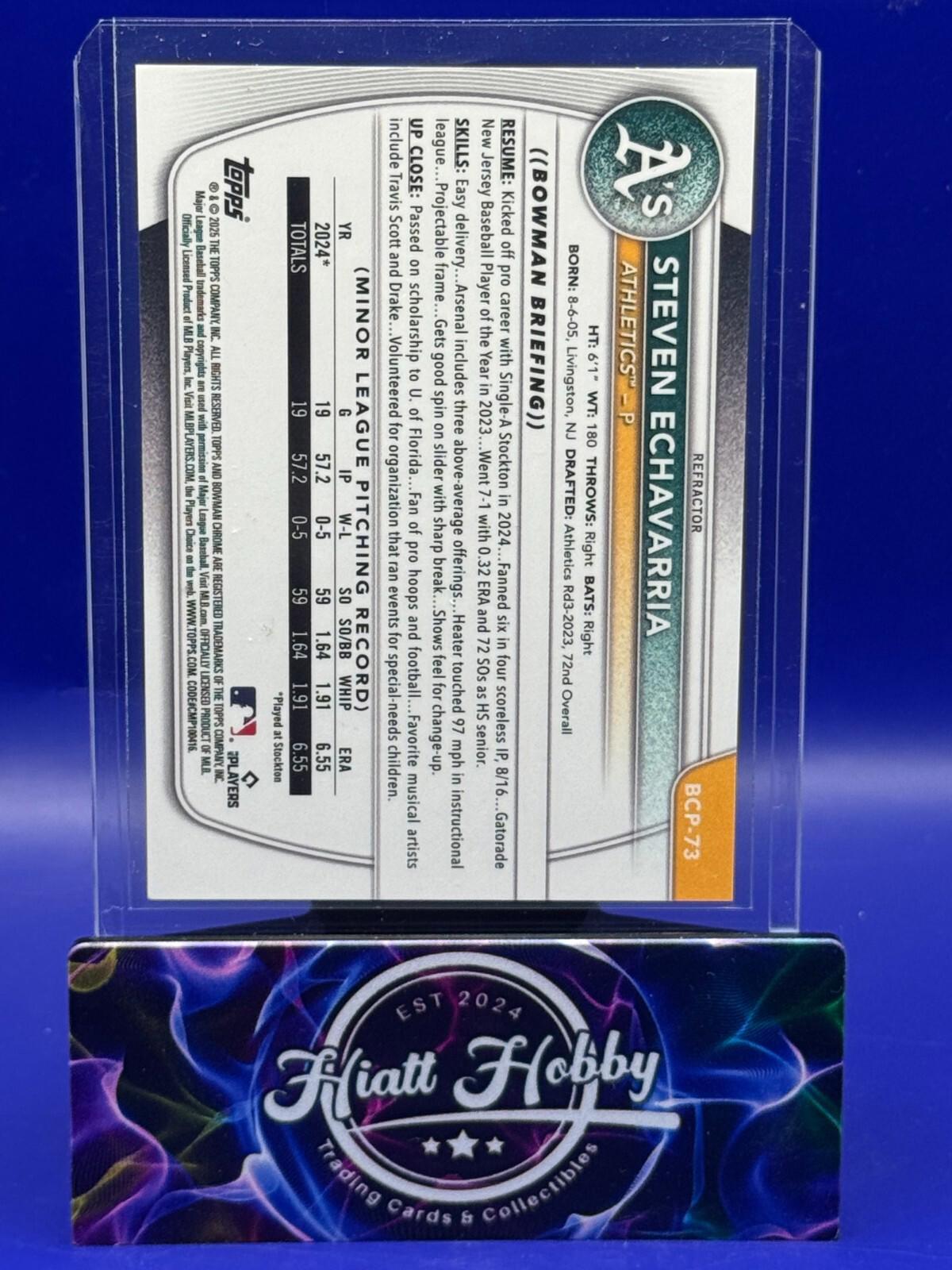 The 2025 Bowman Chrome Steven Echavarria #BCP-73 Refractor /499 (RC) trading card is a sought-after collectible for baseball fans and card collectors. This rookie card features a Chrome Refractor parallel variety that adds a shiny and reflective look to the standard-sized card. Produced by Topps in the United States, this MLB World Series-themed card is part of the Chrome Prospects insert set and is serial numbered for authenticity. With its limited print run of 499, this original card is a valuable addition to any sports trading card collection.