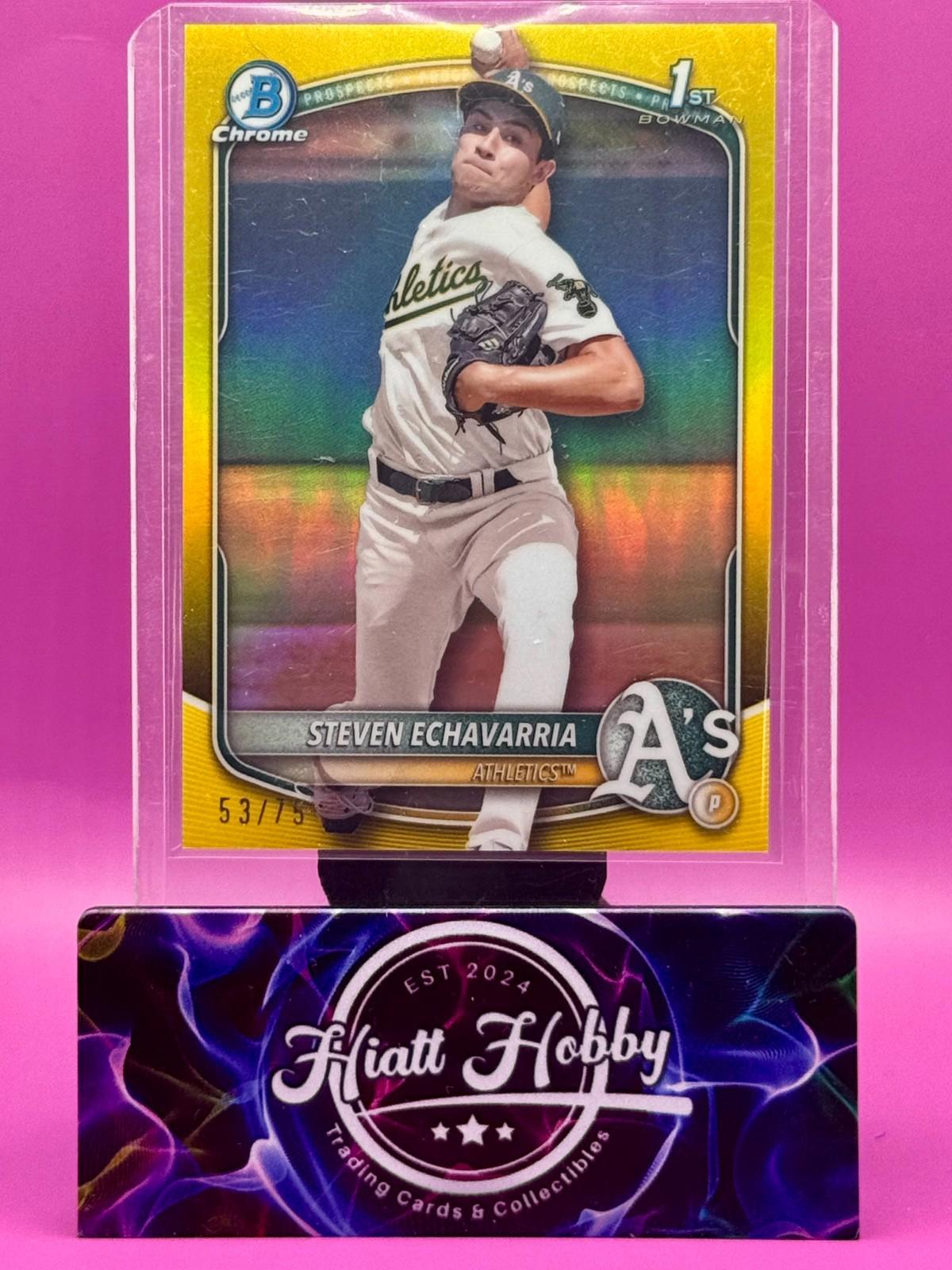 The product is a 2025 Bowman Chrome baseball trading card featuring Steven Echavarria of the Oakland Athletics. This card is a Yellow Refractor parallel, numbered out of 75, and part of the Chrome Prospects insert set. Manufactured by Topps in the United States, the card is made of card stock and is an original release for the 2025 season of Major League Baseball. It does not feature an autograph but is designated as a rookie card, making it a sought-after collectible for fans and collectors alike.