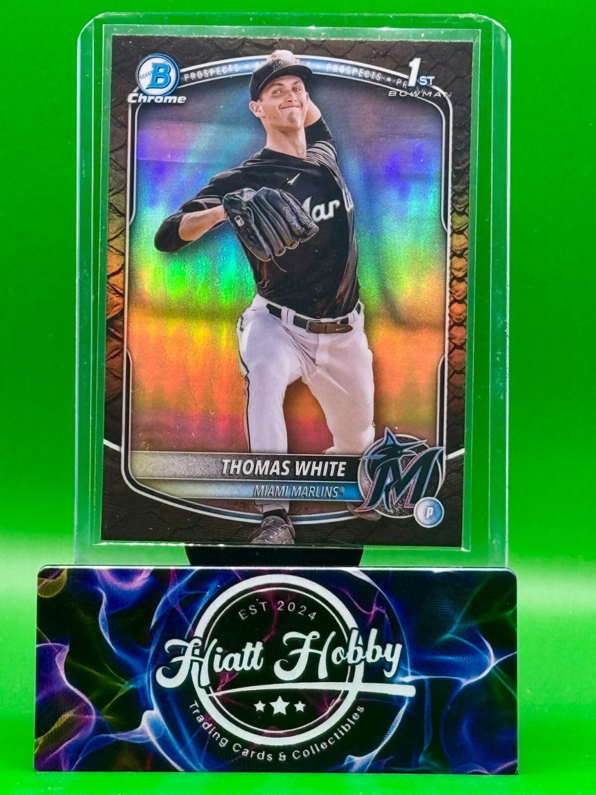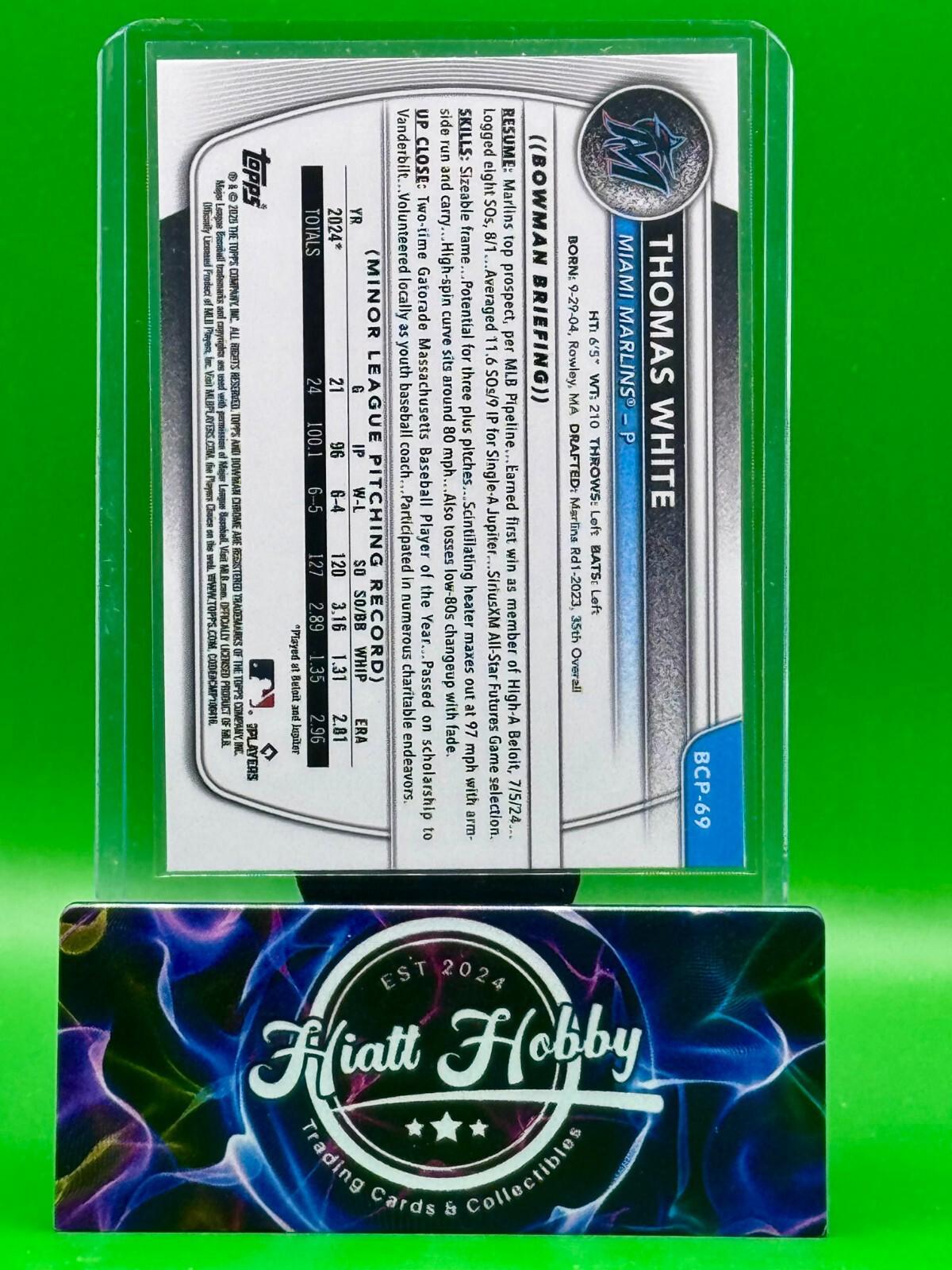 Experience the thrill of the diamond with the 2025 Bowman Chrome Thomas White card #BCP-69, featuring the Reptillian Refractor parallel. This card showcases the potential and prowess of Miami Marlins' up-and-coming talent, capturing the essence of Major League Baseball's exciting 2025 season. As an original release by Topps, it's a must-have for collectors and fans alike, celebrating the sport with exceptional quality and design.Crafted in the United States, this English-language trading card is a true gem for those who appreciate the Rookie features and the history of the MLB World Series event. It's not autographed, allowing the sleek chrome finish and the Standard card size to shine, making it a standout addition to any baseball card collection. Step up to the plate and add this piece of baseball history to your personal showcase.