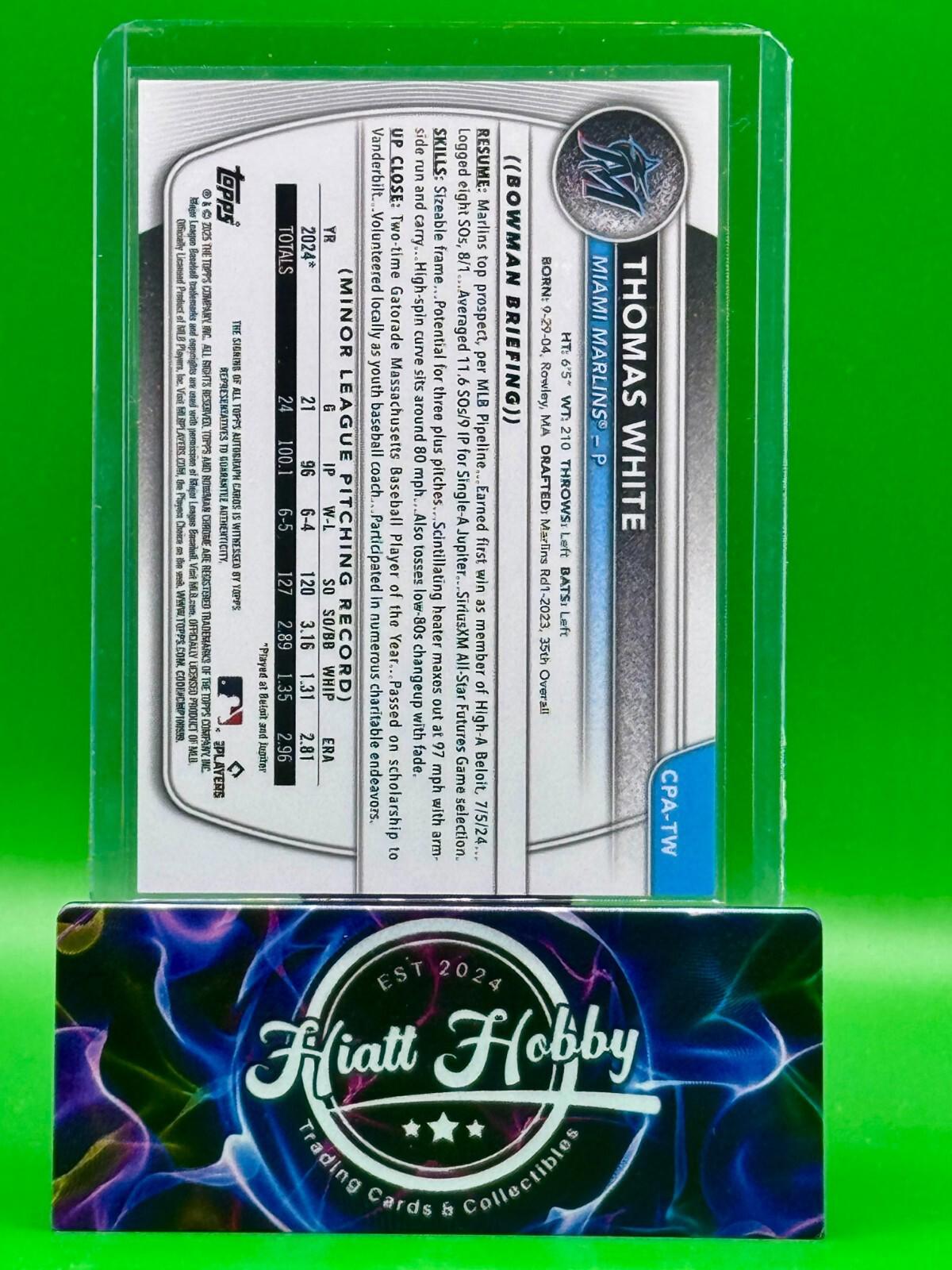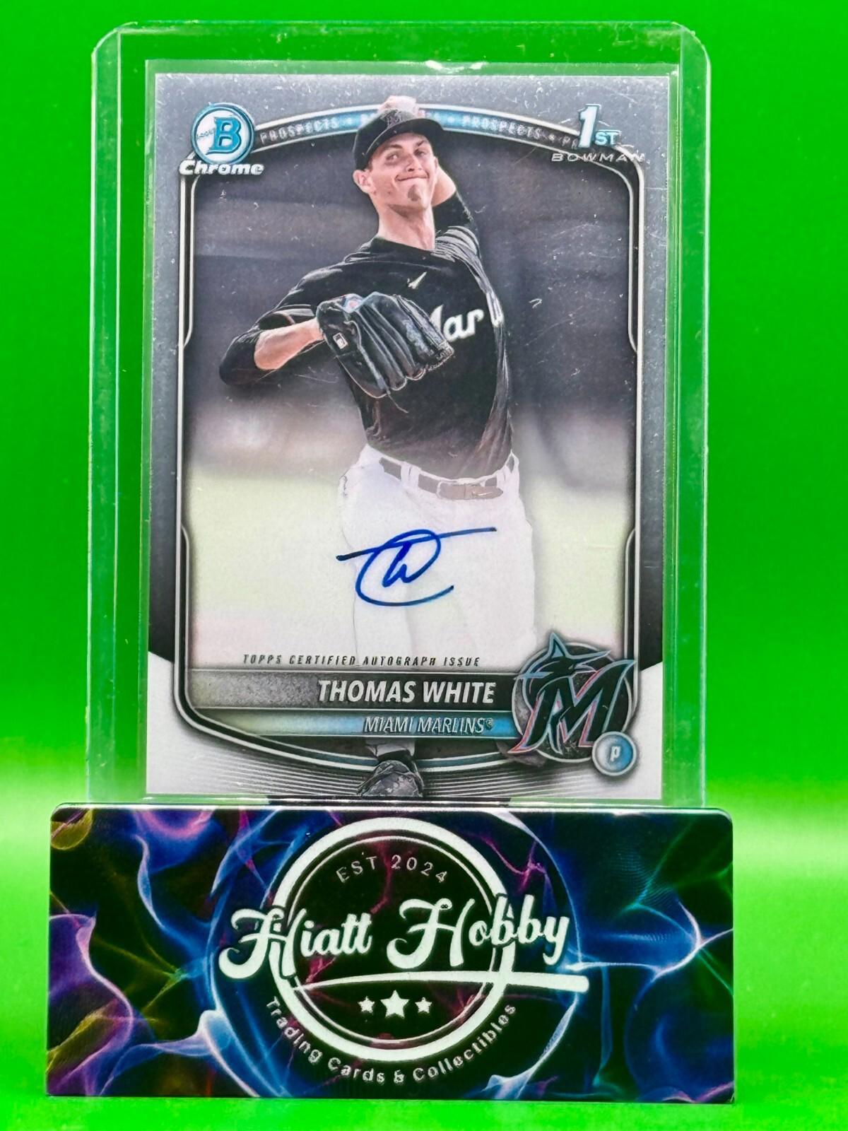 Capture a piece of baseball history with the 2025 Bowman Chrome Thomas White card #CPA-TW, autographed by the Miami Marlins standout. This Rookie card, hard-signed by White himself, is a must-have for collectors and fans, authenticated by Topps to ensure its legitimacy and value. The Chrome parallel variety adds a sleek finish, making it a standout in any collection.The card celebrates the 2025 MLB season, capturing the essence of the sport in pristine English. It's a celebration of an athlete's career, encapsulated in a collectible that honors the Major League Baseball World Series. Proudly made in the United States, this card is a tangible piece of the future of baseball, ready to be a highlight of your assortment.