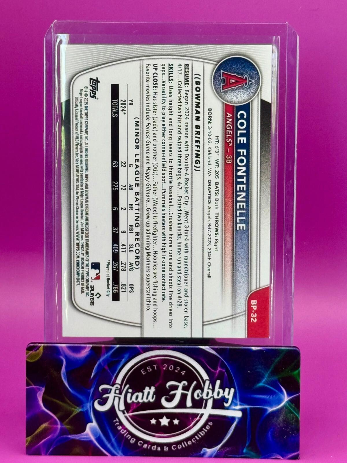 The 2025 Bowman Cole Fontenelle #BP-32 Blue Border /150 trading card is a limited edition collectible featuring the talented baseball player from the Los Angeles Angels. Manufactured by Topps, this original sports trading card is made of paper with a 20 Pt. thickness. This serial numbered card is part of the Prospects insert set and is a parallel/variety with a blue border. Perfect for fans of Major League Baseball looking to add a unique and valuable piece to their collection, this card is a must-have for any baseball enthusiast.