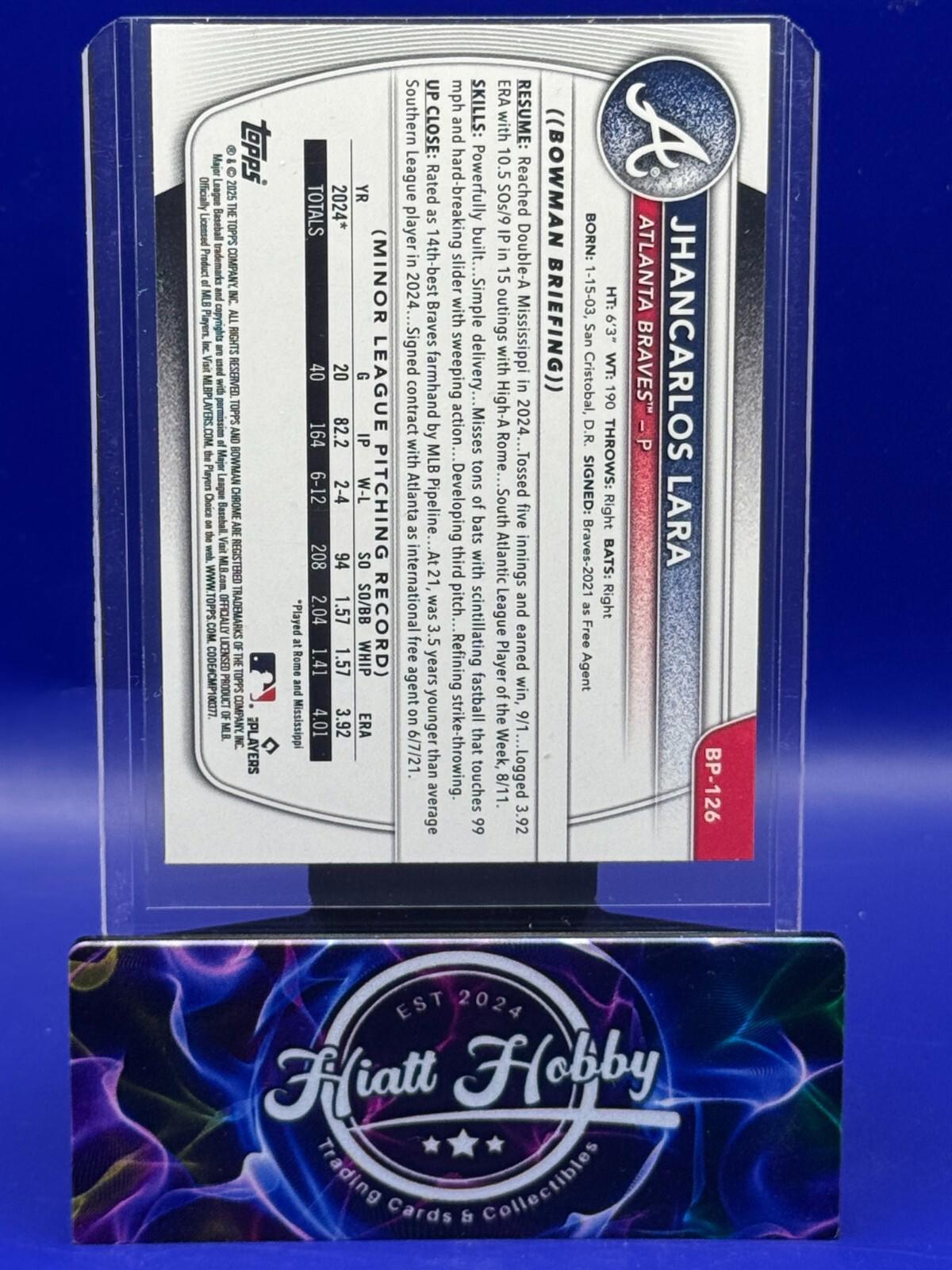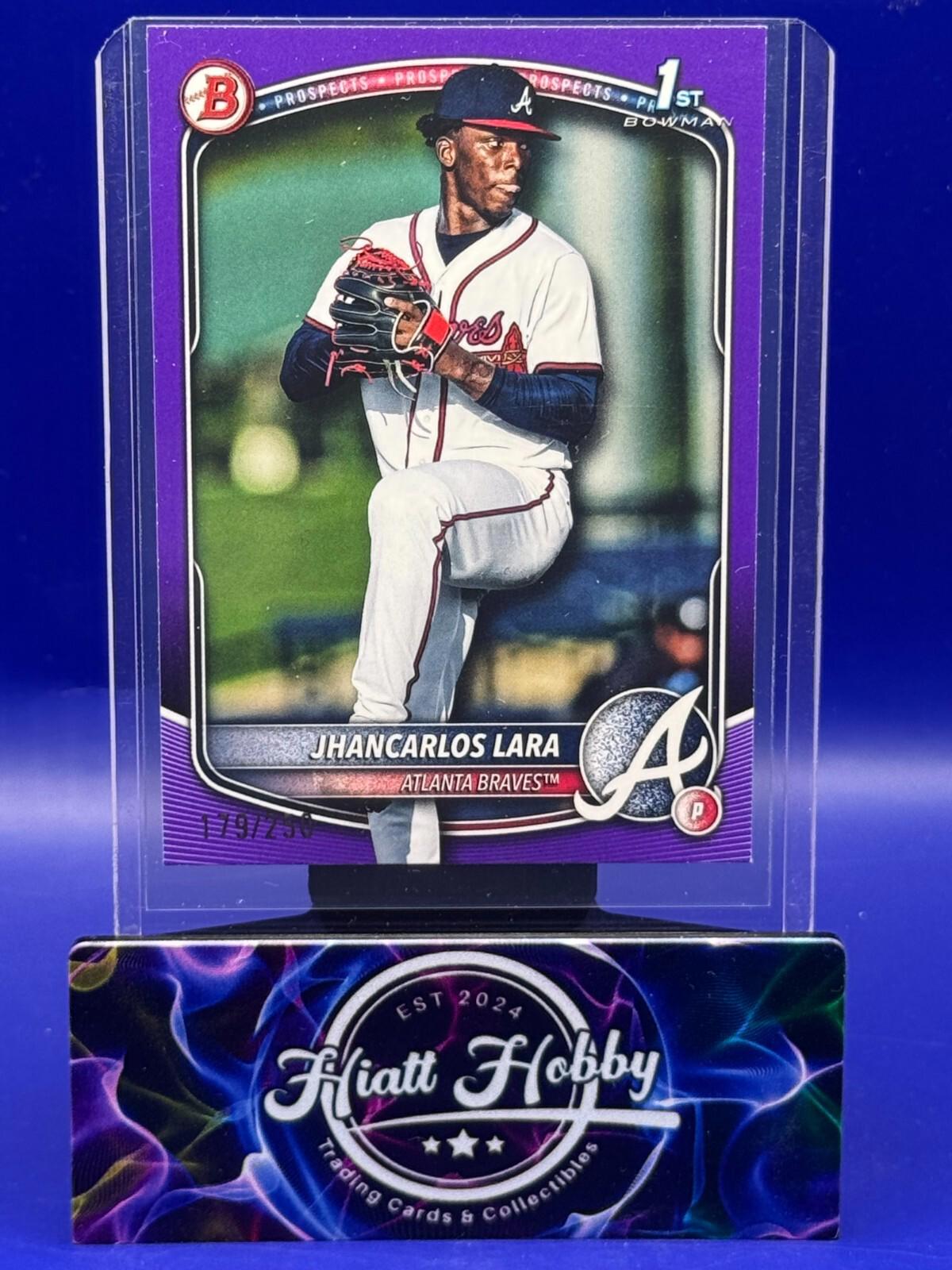 The 2025 Bowman Jhancarlos Lara #BP-126 Purple Border baseball card is a limited edition rookie card featuring a purple border with a print run of only 250 copies. Manufactured by Topps, this original sports trading card is part of the Prospects insert set for the MLB World Series. It showcases the player Jhancarlos Lara from the Atlanta Braves and is a valuable collectible for baseball fans and card enthusiasts alike.