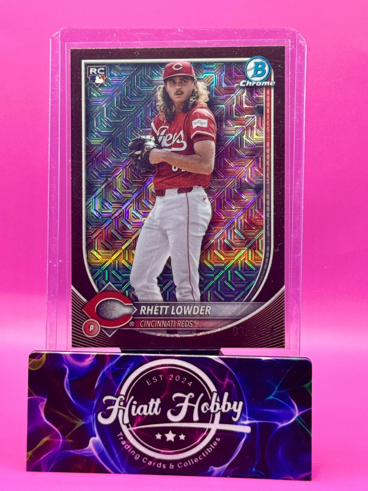 The 2025 Bowman Rhett Lowder #6 Chrome Burgundy Mojo Refractor card is a limited edition baseball trading card featuring Rhett Lowder from the Cincinnati Reds. This original card, part of the 2025 Bowman set manufactured by Topps, is a serial numbered rookie card with a print run of 275. The Burgundy Mojo parallel adds a unique design to this sports trading card, making it a valuable addition for collectors and fans of MLB baseball. Please Read: SHIPPING SCHEDULE We make every attempt to ship your item out quickly.  Our standard shipping schedule is Tuesday, Thursday, and Saturday drops at the post office and we include all items that have been paid for up to 5PM central the day prior.  That is, all purchases that have been paid for by 5PM central on a Monday will be included in the Tuesday shipment.  If the payment is received after the 5PM deadline, it will be part of the Thursday order drop. SHIPPING DETAILS Cards and Magazines are shipped out in padded or rigid envelopes and/or inserts to protect the item.  Individual cards are typically are shipped in a semi rigid card protector and a penny sleeve.  Combined orders will be packaged securely, but may not have a semi-rigid card protector (item will still be well protected) . Larger items are boxed up properly. We cannot control the USPS or UPS when it comes to the timely delivery of an item, their methods and handling of the item. Please DO NOT hold us responsible for the efforts of a delivery service, however, if you suspect damage to the package, please take pictures prior to opening and record the opening.  This would help with any insurance claims and reimbursements. We offer eBay Standard Envelope Shipping for orders at or below $20.  If your order exceeds $20, you must select USPS Ground Advantage for shipping in order for the order to be processed. SHIPPING INSURANCE Any Items that exceed $100 will include additional handling charges.  This fee is to cover the cost of insuring the item during transit. INTERNATIONAL SHIPPING We are pleased to now offer international shipping! PICTURES All photos are of the item you are bidding on when bidding on single item listings and will not be swapped out for other versions. Items that have multiple quantities will be in similar or better condition. PICTURES For listings that do not have variations, the card depicted in the photo is the card you will receive.  In cases that the listing has variations, the card may not be the same, but each card is inspected to ensure the same level of condition. MULTIPLE PURCHASES When purchasing multiple item from us, please wait to discuss before paying.  We will combine shipping for you and try to save some money. RATINGS & FEEDBACK If you have an issue with something, please try and contact us first so that we may try and work it out. If we come to a satisfactory conclusion, please consider providing a favorable review and positive feedback. Thank you so much for any business that you do with us.