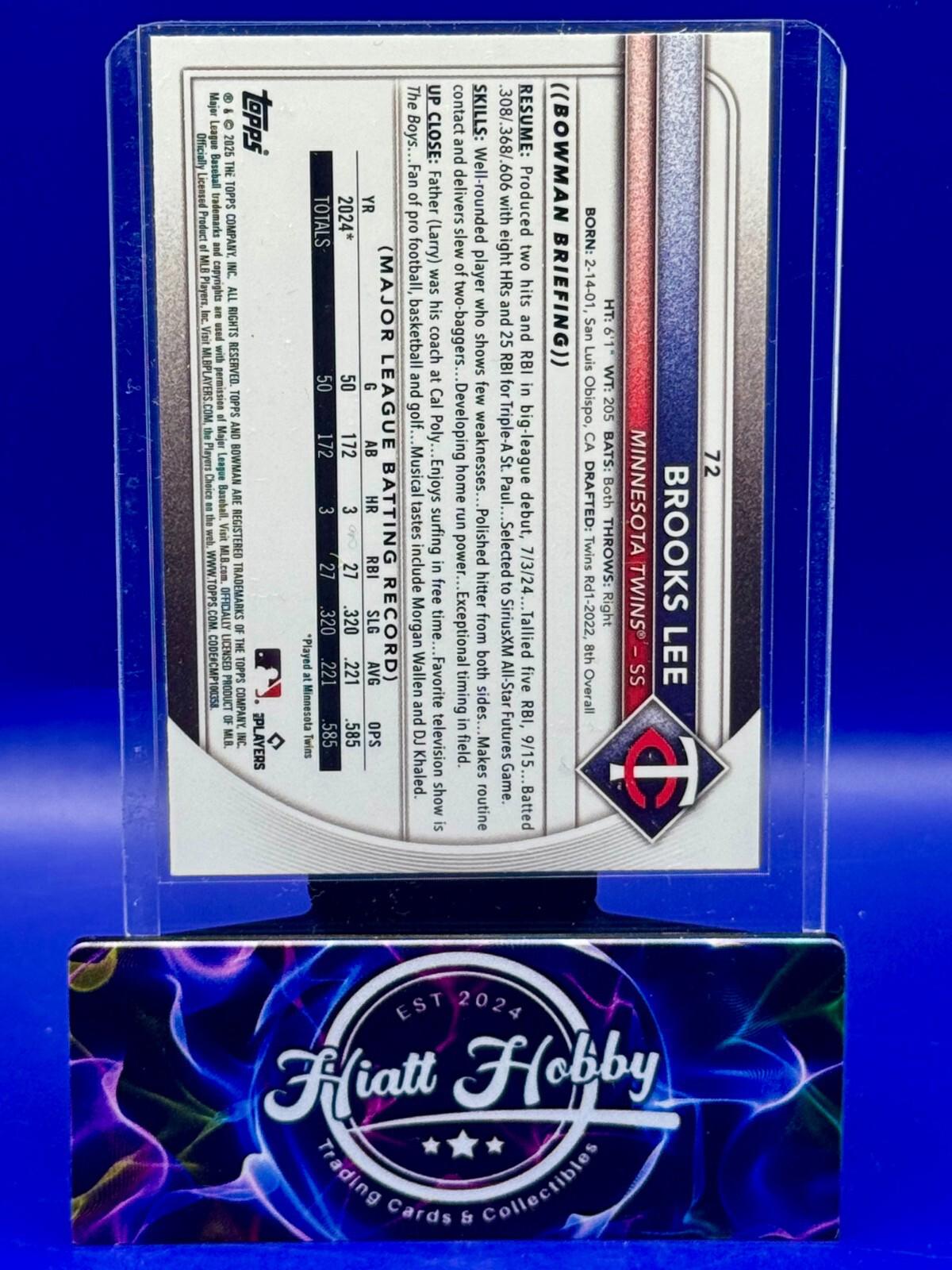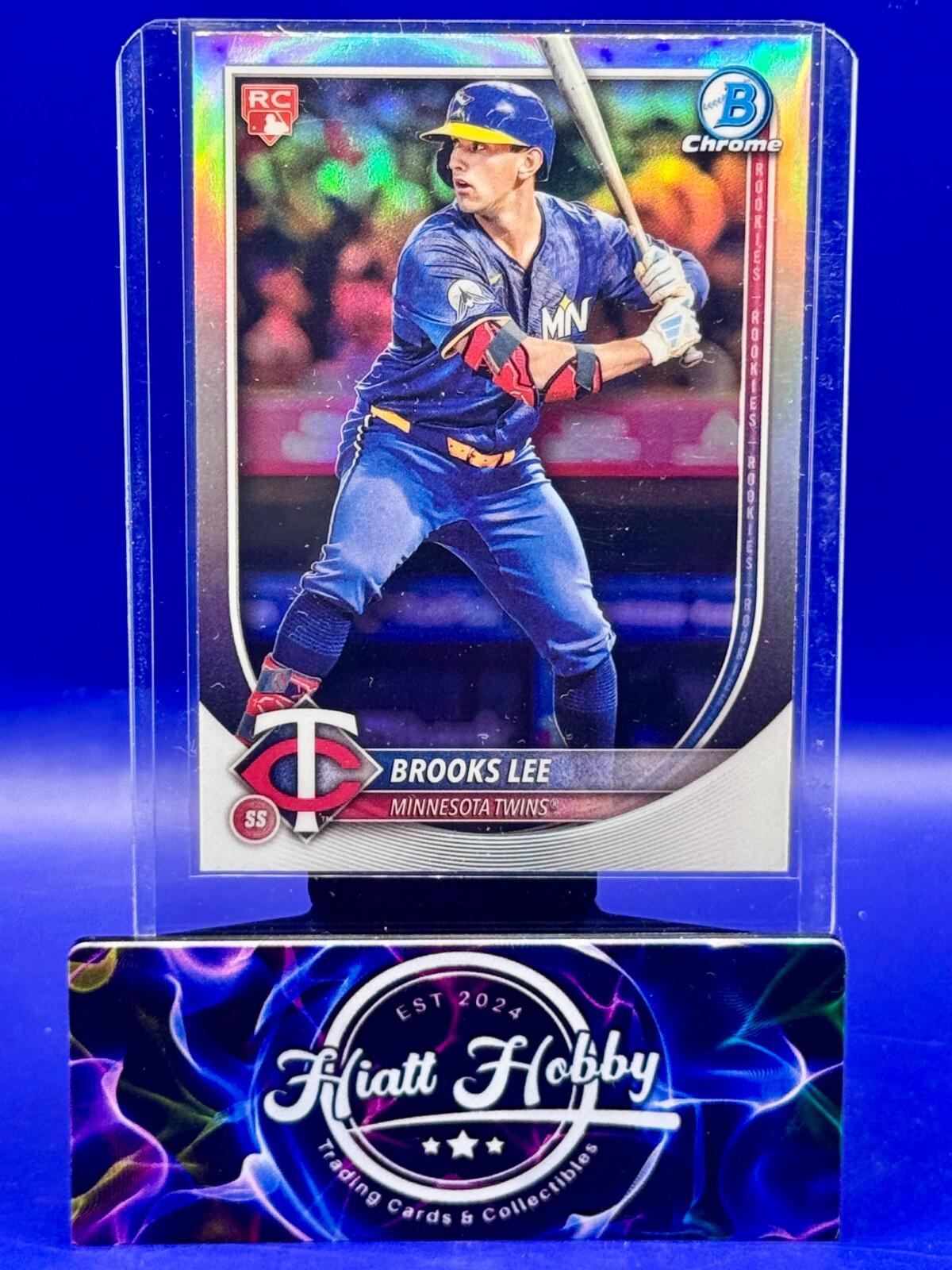 The 2025 Bowman Rookie Red RC Variation Brooks Lee #72 (RC) is a standard-sized sports trading card featuring Major League Baseball player Brooks Lee. Manufactured by Topps as part of the 2025 Bowman set, this original card is a Red Rookie Redemption insert, making it a special addition to any baseball card collection. As a Chrome Refractor parallel variety, this card stands out with its unique design and language in English. This Rookie Variation card is sure to be a sought-after item for fans of the Minnesota Twins and baseball enthusiasts alike.