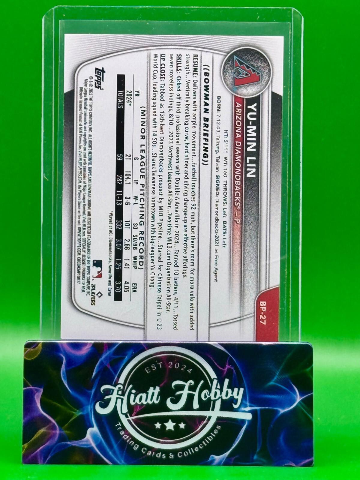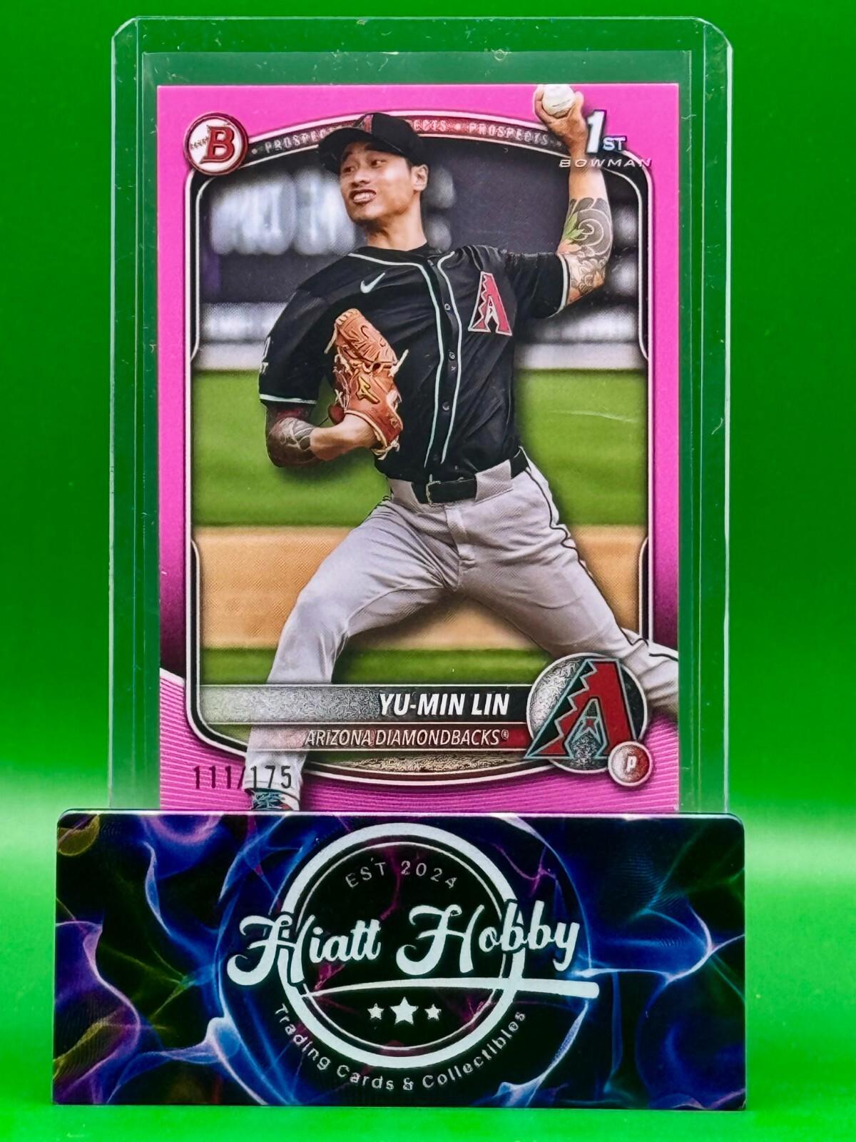 Capture the essence of the game with this 2025 Bowman sports trading card featuring the promising talent, Yu-Min Lin, of the Arizona Diamondbacks. As a part of the 2025 season set, this card is a must-have for collectors and fans alike, showcasing the player in the iconic MLB World Series event.The card, numbered BP-27, is a stunning pink parallel/variety on high-quality paper, with a limited print run of just 175. It is a true original, manufactured in the United States, and presents the athlete in crisp, standard card size. Celebrate the spirit of baseball and add a touch of rarity to your collection with this exquisite piece.