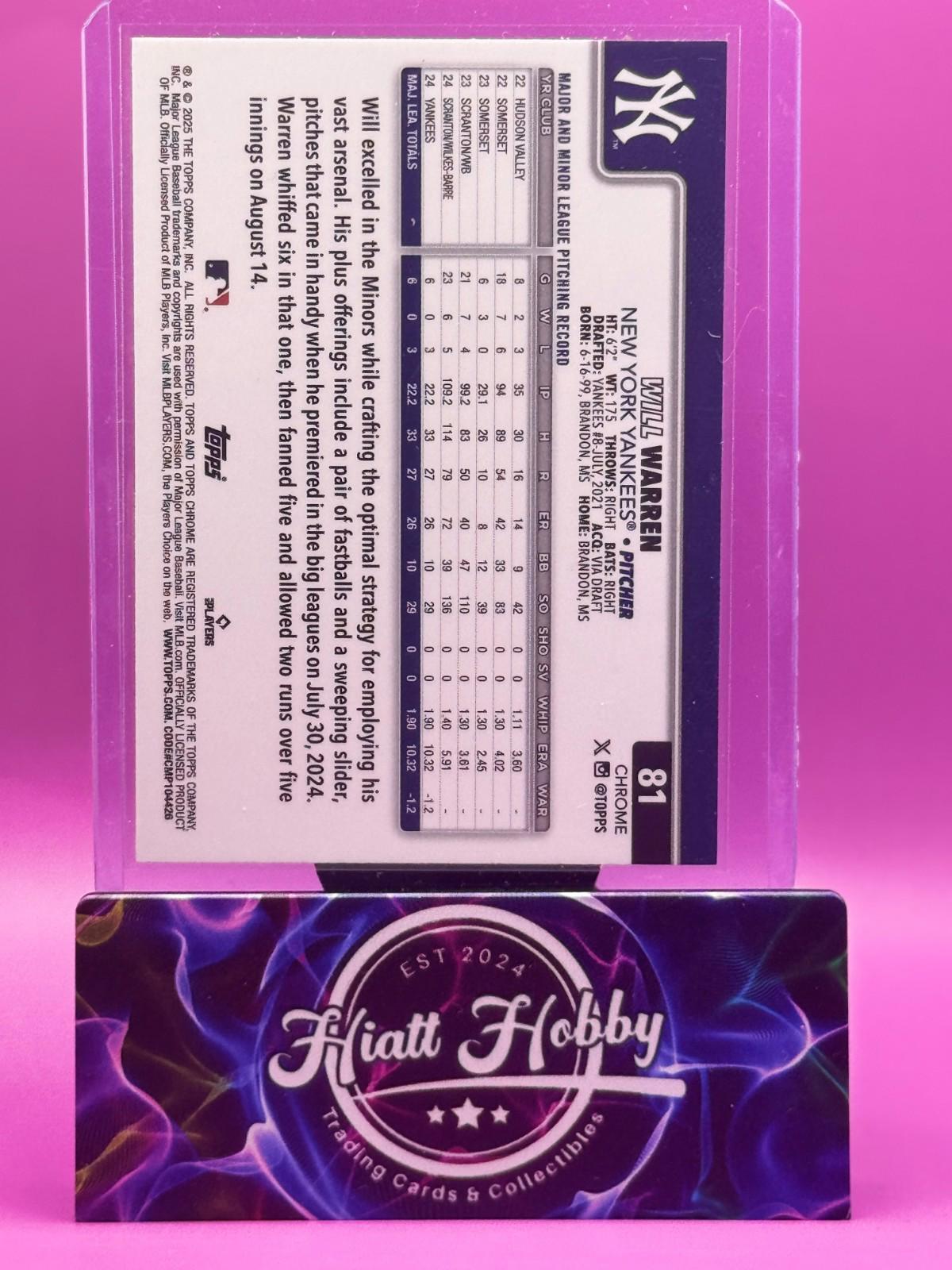 The 2025 Topps Chrome Logofractor featuring Will Warren #81 in a Purple parallel limited to only 250 copies is a highly sought-after sports trading card for baseball collectors. This original card is made of sturdy card stock with a thickness of 35 Pt., showcasing the player from the New York Yankees team in the Major League Baseball league. With features like being serial numbered and designated as a rookie card, this English-language collectible is a unique addition to any sports memorabilia collection, especially for fans of the MLB World Series tournament.