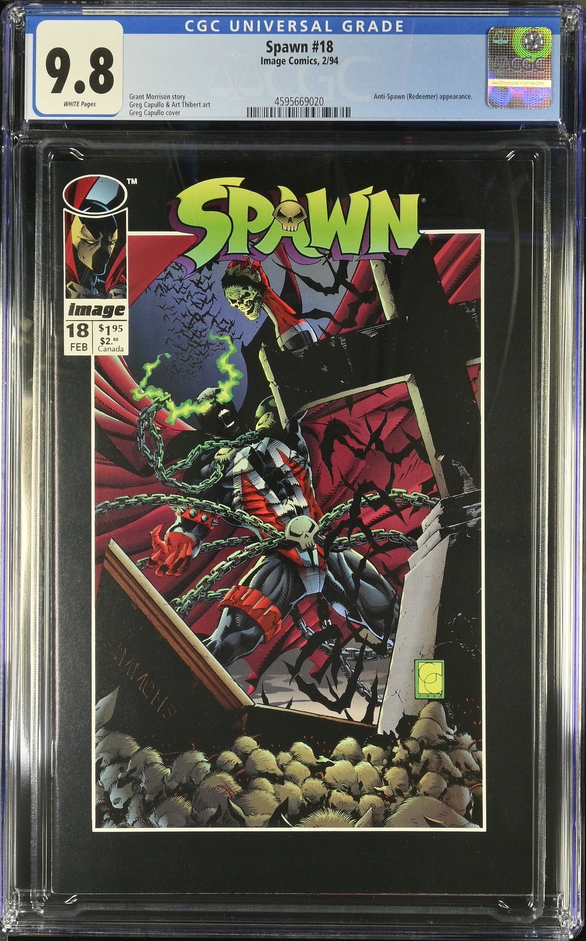 Spawn #18 from 2/94 offers a glimpse into the era's iconic storytelling. Featuring anti-spawn (redeemer) appearance., this issue is a must-have for collectors. Add this CGC 9.8 graded comic to your collection today!