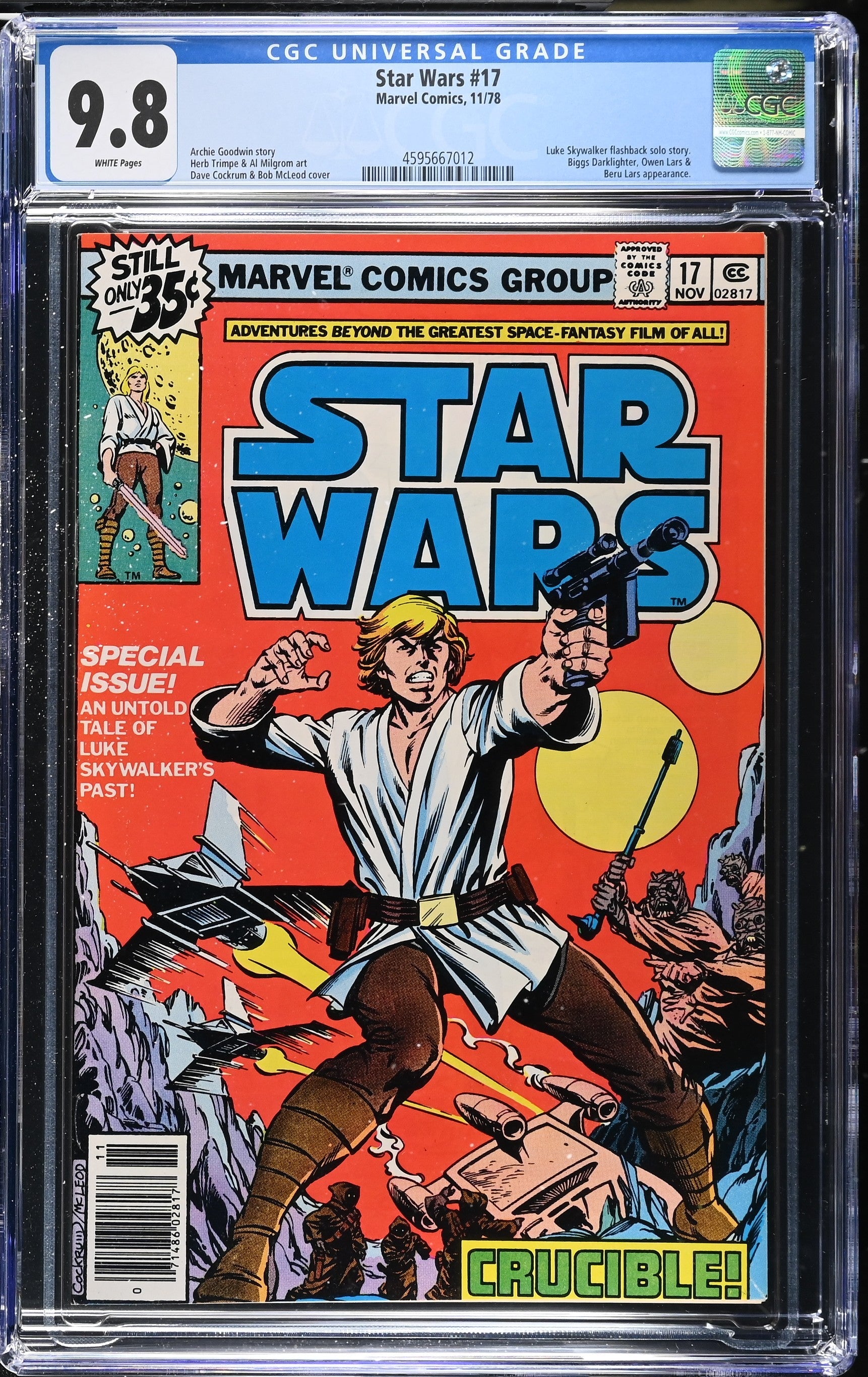Star Wars #17 from 11/78 offers a glimpse into the era's iconic storytelling. Featuring luke skywalker flashback solo story., biggs darklighter, owen lars &, beru lars appearance., this issue is a must-have for collectors. Add this CGC 9.8 graded comic to your collection today!